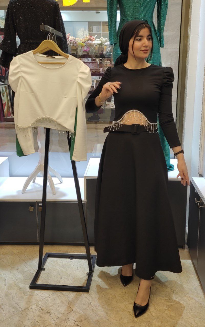 جنس. کرپ دالقیچ، دوخت مزونی به همراه نگین کاری شده.